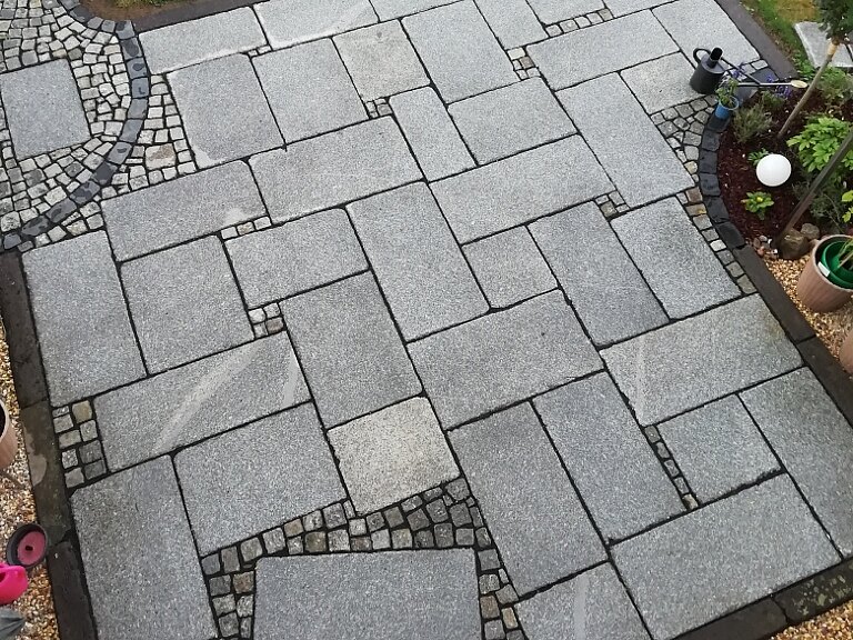 We offer small granite cobblestones (8 / 11 cm) and large granite cobblestones (17 / 17 cm) für your individual use and design. These are old reclaimed and worn street cobblestones.
