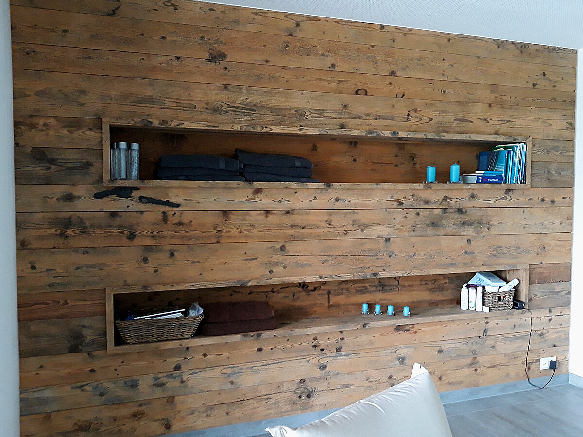 Le bois antique confère à chaque pièce un caractère rustique exclusif, qu'il s'agisse d'un revêtement mural ou d'un revêtement de plafond.