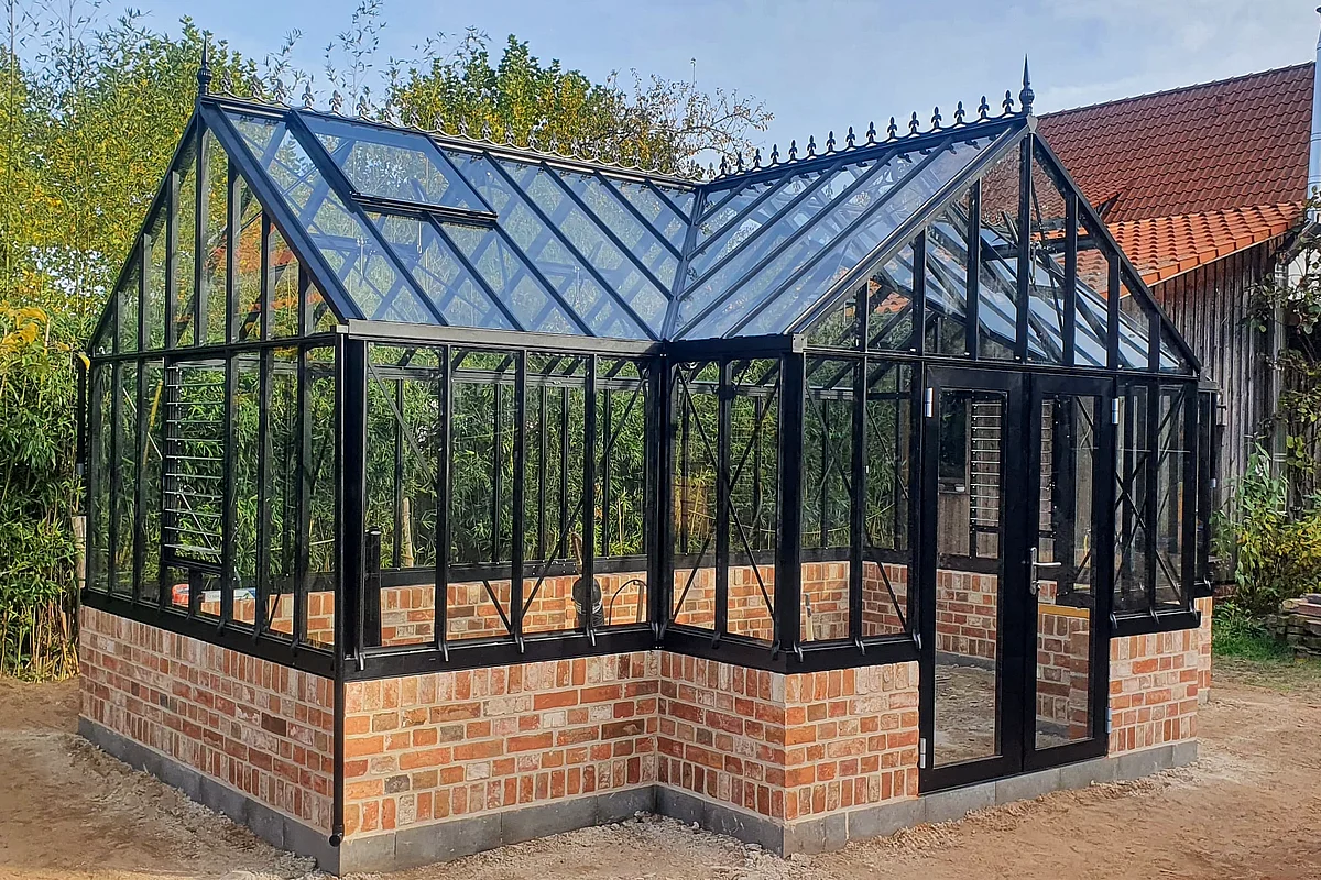 Gewächshaus und Dekoelemente aus alten Ziegelsteinen